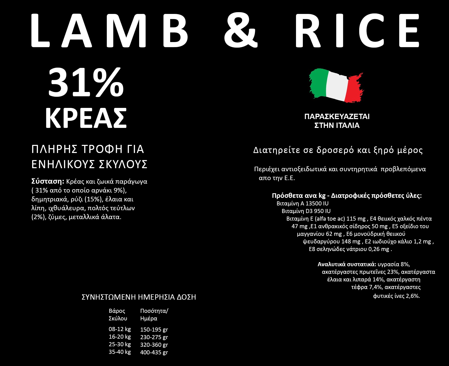 230-275 gr / ημέρα για σκύλους 16-20kg